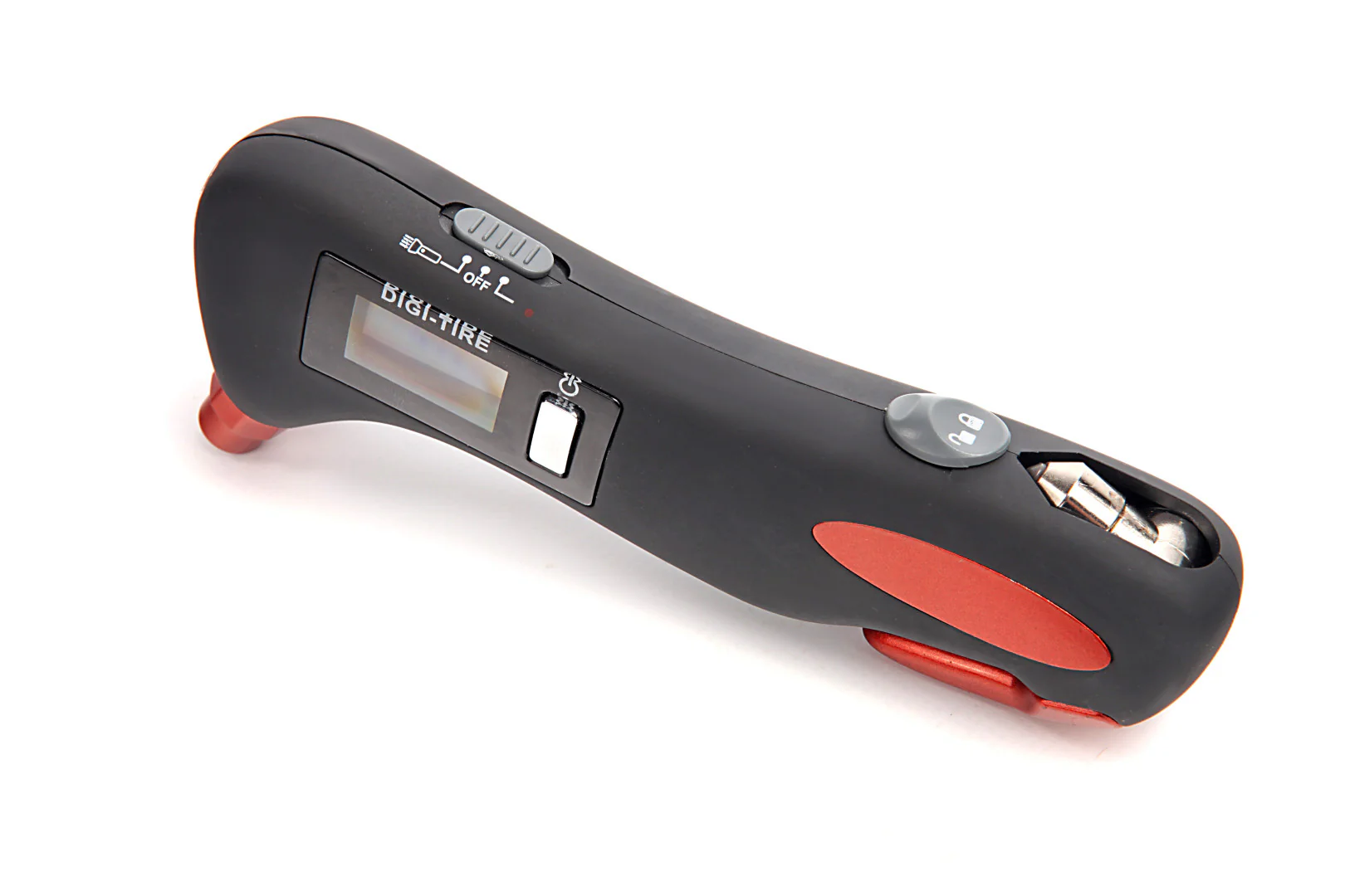 Acest DISPOZITIV DIGITAL MASURAT PRESIUNE ANVELOPE 4 IN 1 are functiile: manometru digital al presiunii in pneuri, lampa LED, ciocan de siguranta si taietor pentru centura de siguranta.